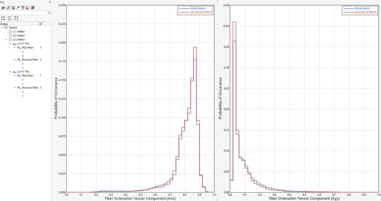 a11(左ウィンドウ)とa22(右ウィンドウ)のヒストグラム例を以下に示します。青いラインが背系メッシュのヒストグラム、赤いラインが構造メッシュのヒストグラムです。注: せん断繊維方向成分(a12、a23、a13)のヒストグラムをプロットする場合は、x成分をInxcreament2として選択します。