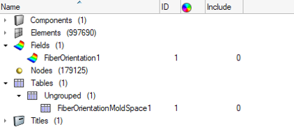 繊維配向テンソルの結果ファイル(*.xmlまたは*.o2d)を参照する"FiberOrienation#"というフィールドと"FiberOrienationMoldSpace#"というテーブルが出力されます。このテーブルには、金型メッシュ(節点と要素)の定義が含まれており、構造メッシュのターゲットメッシュを取り込むために金型メッシュをHyperMeshモデリング環境から削除した場合でも、ソースメッシュの情報が保持されます。図 6.