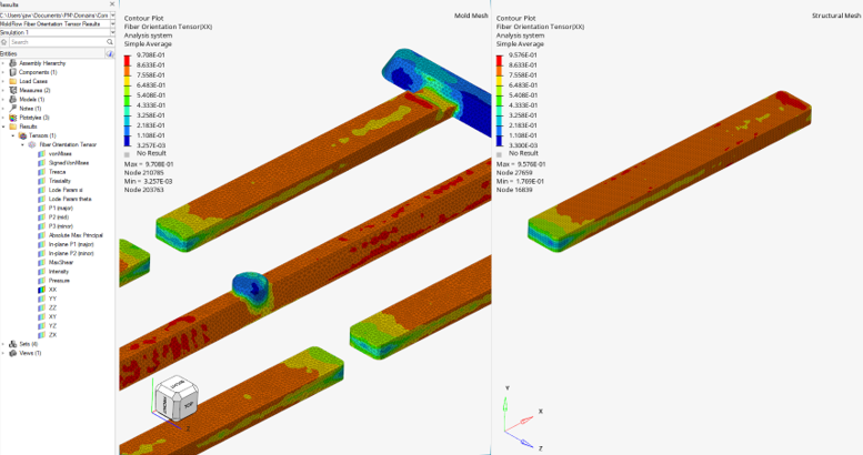 モデルと結果の両方を読み込んだ状態で、任意の繊維配向テンソル成分のコンターを表示し、表示を同期させてマッピングの品質を定性的に評価することができます。