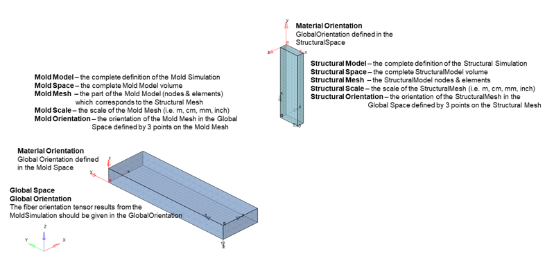 射出成形 – 構造シミュレーションワークフローについて、図 1でグラフィカルに説明します。成形シミュレーション空間と構造シミュレーション空間の定義を図 2に示します。これは、プロセスの説明全体を通して一貫して使用されます。このワークフローの開始点は、遷移強化パートまたはアセンブリの射出成形シミュレーションです。