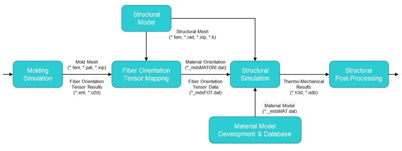 Altair Multiscale Designerの不連続繊維材料モデル(*_mdsMAT.dat)と組み合わせることで、完全な不均質異方性の熱-機械構造シミュレーションを実行できます。射出成形 - 構造シミュレーションワークフローの各ステップの詳細については、以下をご参照ください。