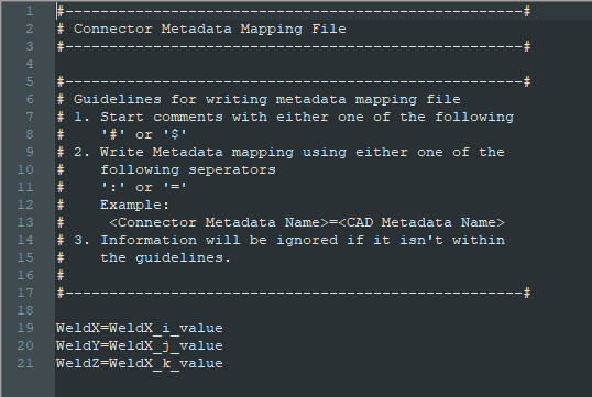以下のようなファイルを作成し、任意のメタデータを選択し、マッピングします:<Connector Metadata Name>=<CAD Metadata Name>