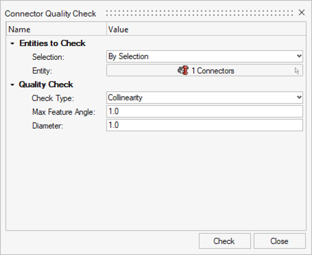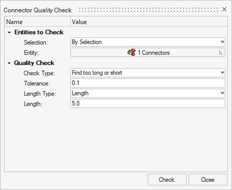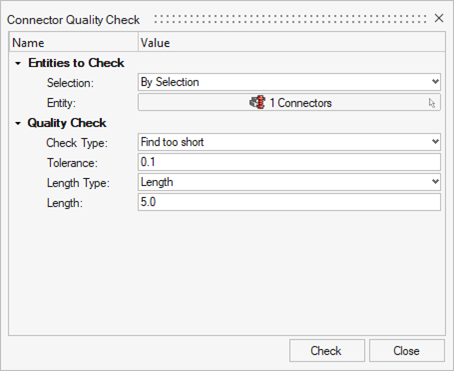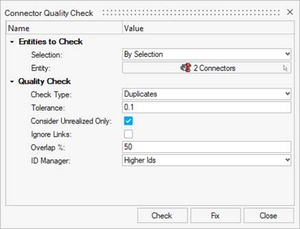 Check Type Check and Fix Action Duplicates 重複するコネクターを削除します(ID Managerの選択オプションに従います)。 Combine 隣接するすべてのコネクターを、すべてのリンクエンティティを結合する1つのコネクターに統合します。 Find Too Long - Find Too Short - Find Too Long or Short - Find Too Close to Edge 指定されたトレランスを満たすために必要な距離だけ、その上にあるサーフェスに沿ってコネクターを移動させます。 Collinearity -
