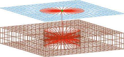 RBODYに属する節点は定義された円筒ボリュームによって決定されます。定義された円筒ボリュームにおいてパート毎に1つの穴が検出された場合、穴の節点のみが接合されます。それ以外の場合は、円筒内のすべての節点がRBODY要素(パート毎)に属します。図 1.