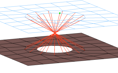KINCOUP要素を作成します。要素を投影し、穴を形成するシェル要素に隣接する節点、更にワッシャー層を形成する節点を結合します。コネクターは穴のエッジ、穴の中心、その中間、穴またはワッシャー層を形成する2列目に配置できます。