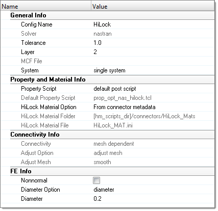 - 関連するPBUSHカードと共に作成されます。CBUSH要素はこのプロパティを参照します。属性は、選択されたHiLock材料、プロパティ、および結合されたシェルの材料に基づき計算されます(PSHELLまたはPCOMP)。