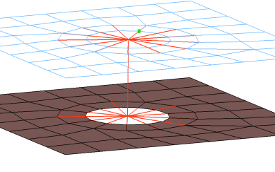 xの回転自由度は、拘束されます。head要素を投影し、穴を形成するシェル要素に隣接する節点、更にワッシャー層を形成する2列目の節点に結合します。コネクターは穴のエッジ、穴の中心、その中間、穴またはワッシャー層を形成する2列目に配置できます。