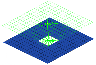 wagonwheel このリアライゼーションは、ボディにRBE2を作成し、投影して穴のエッジ節点とRBE3 要素と共に結合します。 制約事項: NastranおよびOptiStructで使用できます。 図 1.