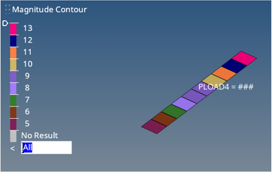 | PLOAD4 | Pressure | Defines a load on a face of a HEXA, PENTA, TETRA, PYRA, TRIA3, TRIA6, QUAD4, or QUAD8 element. It can also be used to define the EXCITEID field (Amplitude "A") of dynamic loads in RLOAD1, RLOAD2, TLOAD1 and TLOAD2 Bulk Data Entries. Additionally, the PLOAD4 entry can be defined as Follower Loads in Large Displacement Nonlinear Analysis. |