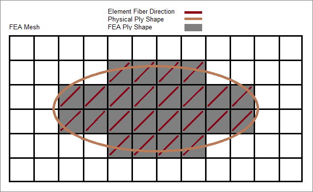 FEAプライの形状(領域)は、物理プライの複雑な形状を最も正確に表す要素を選択することによって定義します。図 1では、楕円の物理プライ形状が茶色のラインによって定義されています。対応するFEAプライ形状は、関連付けられたFEAメッシュのグレイの陰影のついた要素によって定義されます。一般に、ある要素の重心が物理プライ形状の境界内に存在している場合、その要素はFEAプライ形状の一部と見なされます。