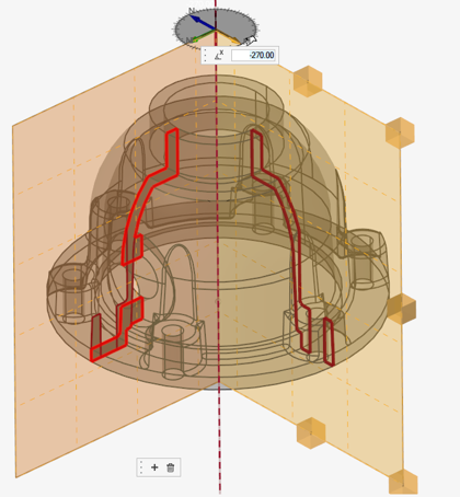 ソリッド選択後、インスタンス数(def 1)、つまり360°の範囲での繰り返し回数を定義するためにマイクロダイアログが開かれます。メインサーフェスに投影された軸を中心にボディがスイープされます。サーフェスレベルで、ボリューム低減を考慮した追加パラメーターが保存されます。