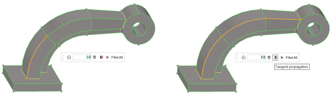 次の図に示すように、Tangent propagationオプションを使用して、元の選択範囲に接続された追加のサーフェスエッジを選択できます。