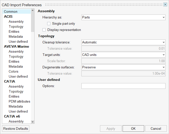 - Import OptionsをクリックしてCAD Import Preferencesダイアログを表示します。