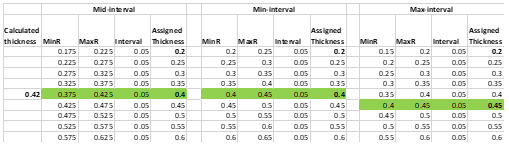 - 板厚の値は、Maximum thickness range interval欄に入力された値と同じ小数桁数になるように切り上げまたは切り捨てが行われます。3つのモードを利用できます。Automaticでは最適な切り上げまたは切り捨てが決定されます。