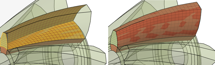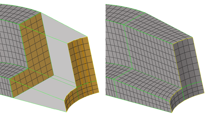 図 20. . ソース要素と複数のフェイスと要素をガイドとして作成したメッシュ。Topo(2D/3D)要素フェイスがサポートされます。