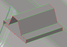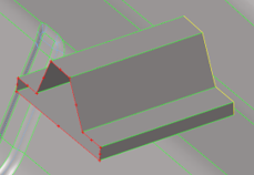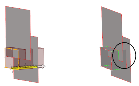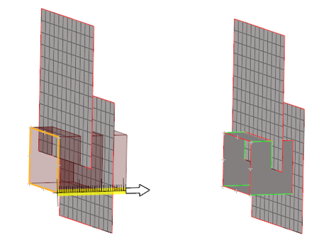 ラインや節点を押し出す際、連続的なサーフェスまたはメッシュが交差していて、このオプションがオンになっていると、新規作成されたサーフェスは交差位置でトリムされます。自動トリムオプションは、ジオメトリと交差しているジオメトリおよびメッシュと交差しているジオメトリの両方に対して機能します。このオプションは、FEトポロジーと交差しているFEトポロジーに対しても機能します。