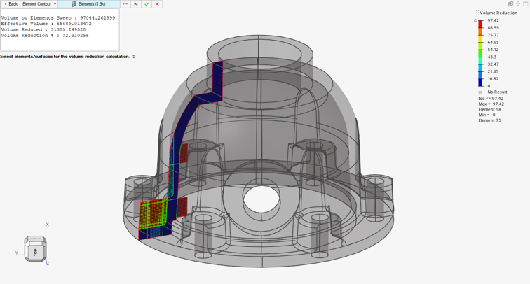 - 軸対称エンティティが、1つのセクター(1/4や1/8など)のみを表すソリッドから作成された場合は、ソリッドの選択を完了して正確な体積削減量を取得します。