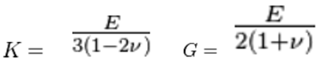 ここで、E はヤング率、ρ は材料密度、𝜐 はポアソン比、K は体積弾性率、G はせん断弾性率を表します。