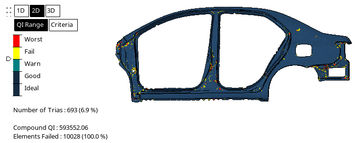 要素品質ビューを有効にすると、2D/3D要素基準値設定によって定義された品質に基づいて、要素が色付けされます。移動可能な凡例がモデリングウィンドウに表示され、要素品質を簡単に評価できるようになります。モデルのCompound QIの概要や問題のある要素の数 / パーセンテージも、レジェンドの下に表示されます。図 1.
