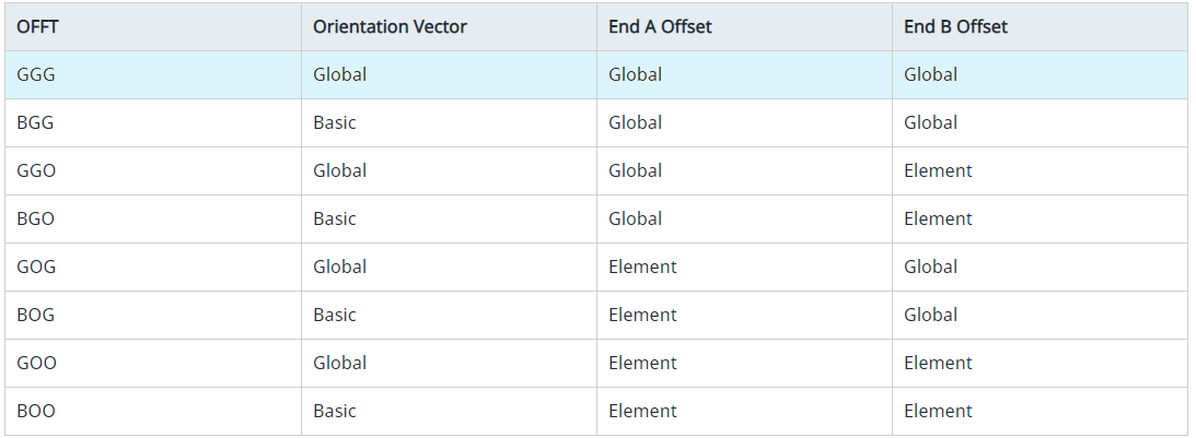 前述のオフセットツールのほとんどでは、要素座標系でオフセット値(End AとEnd B)が自動的に適用されます。したがって、これらのツールの使用時は、OFFTが自動的に更新されます(向きを表す先頭文字は変更されません)。