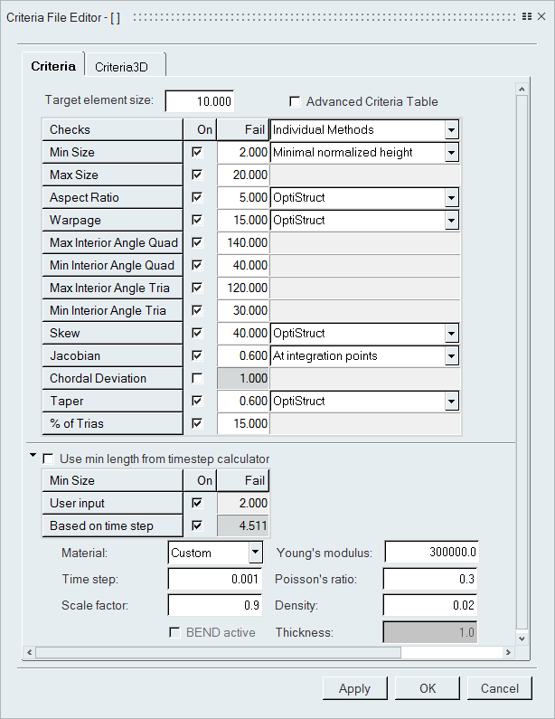 Criteria3Dタブをクリックして、現在の3D要素の基準値を編集します。