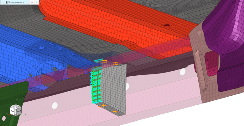 隔壁は新しいコンポーネント内に作成されます。適切なプロパティカードイメージ(例: OptiStructソルバープロファイルのPSHELL)も作成されます。図 6. 作成が完了した隔壁