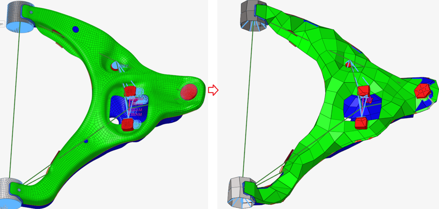 既存のメッシュがシミュレーションの求めるものと比べてより細かく複雑な場合があります。これにより、特にユーザーの目的がNVH(騒音、振動、操作性)または同様な解析のリアルタイムアニメーションを見ることである場合、シミュレーションもしくは既存の要素に依存したユーティリティの実行時間が無駄に長くなることがあります。