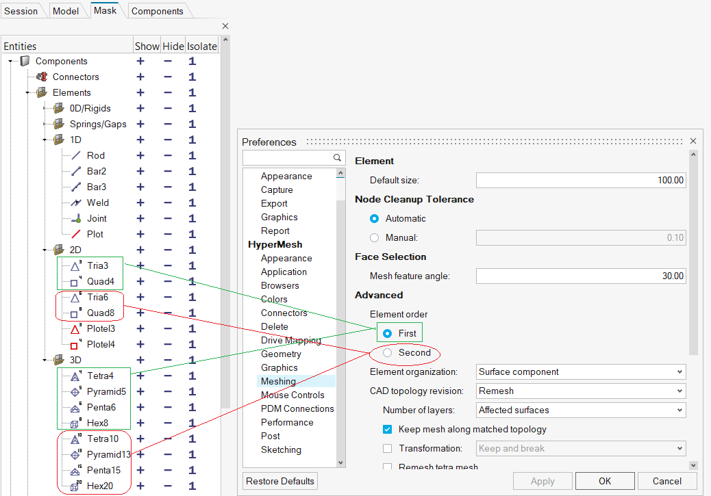 デフォルトでは、1次要素が作成さ れ、ソルバー固有の要素タイプ/コンフィグは element type パネルから特定されます。2次要素を作成するには、メッシング要素順序の優先順位をSecondに設定します。図 5.