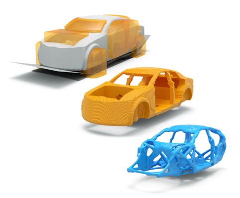下の画像は設計空間のプロセスで、1番上のモデルはエンベロープがオレンジ色の透明なボリュームとして表示されています。これらのエンベロープボリュームは、ボクセル設計空間が作成される際に除外されます(中央の画像参照)。