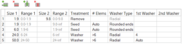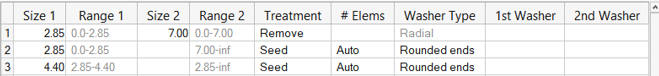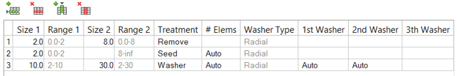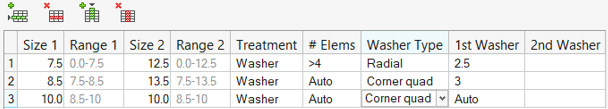 | 1st Washer/2nd Washer/3rd Washer | 1層目、2層目、3層目のワッシャーの幅の均一な値(ドロップダウンから空白を選択し、値を入力)、穴の半径との比率(0.6*radiusなど)、減算式(14.0-radiusなど)、または要素品質に基づく自動決定を設定します。 注: Auto for widthが指定されていると、適切なワッシャー要素が存在しない場合にワッシャーが作成されないことがあります。 |