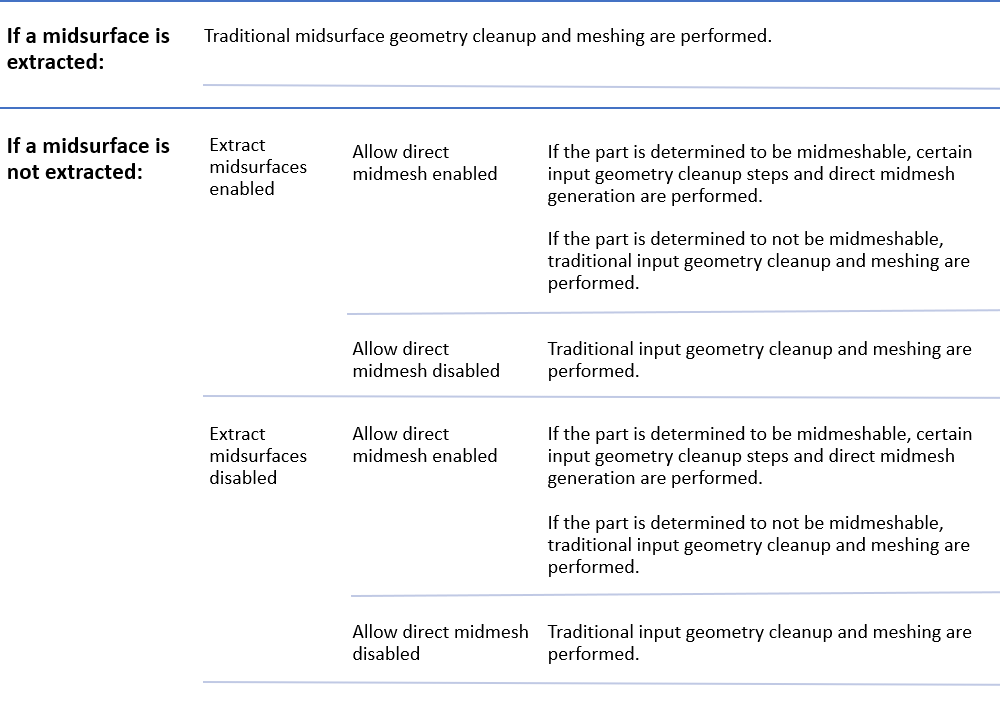 - Extract midsurfacesチェックボックスを選択し、選択された抽出方法を使用してメッシングを実行する前に中立面サーフェスを抽出します。中立面形状のみにメッシュが作成され、元の形状は削除されます。 注: このオプションを選択すると、Midsurface設定がアクティブになります。