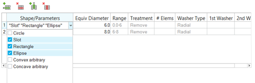 混合穴のサイズと追加オプションを定義するテーブルを作成します。さまざまな形状の組み合わせをサポートします。形状とその処理設定に基づいて相当直径を指定できます。