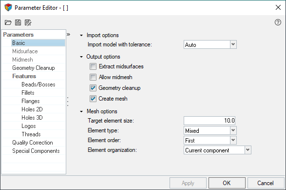 基本パラメータには、インポート、出力、メッシングが含まれます。