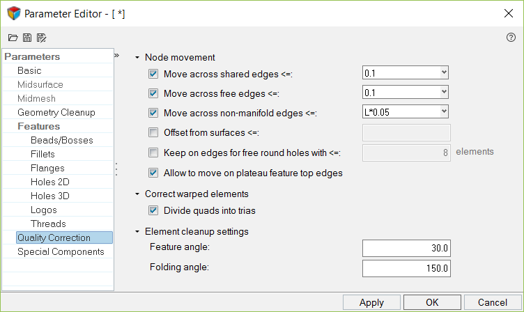 Geometry Cleanupパラメータは、BatchMesherによる各種の形状フィーチャー認識を実行可能な状態にし、そのタスク準備を行います。