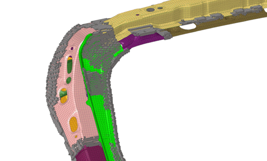 図 1 は、剛性を高めるために構造用接着剤が使用されたサンプルの自動車モデルを示していますが、接合長さは最適化されていません。 図 2 は、このページで説明しているプロセスに従って接合設計空間に変換されている元の接合を示しています。 図 3 と図 4は、それぞれ最適化の前と後の構造用接着剤を示しています。最適化されたモデルでは、パフォーマンス上の利点は同等ですが、接着剤の量が大幅に節約されます。