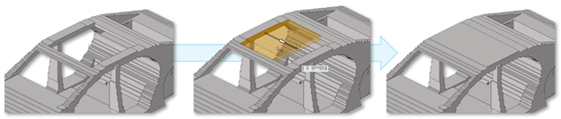 この例で、ボクセルメッシュを修正するために、ハイライト表示されているボクセルを切り離し、そのモデル部分をMoveツールによって目的の位置に移動してから、グローバルツールを使用してボクセルを再生成し、再びステッチしています。図 4.