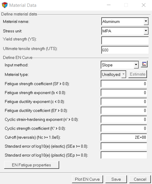 欄名 値 Material Name 要素の材料に基づいて自動的に決定されます。 Stress Unit MPA、PA、PSI、またはKSI Yield Strength (YS) 値入力 Ultimate Tensile Strength (UTS) 値入力 Input Method SlopeまたはEstimate from UTS Material Type 要素の材料に基づいて自動的に決定されます。 Fatigue Strength Coefficient 値入力 Fatigue Strength Exponent 値入力 Fatigue Ductility Exponent 値入力 Fatigue Ductility Coefficient 値入力 Cyclic Strain-Hardening Exponent 値入力 Cyclic Strength Coefficient 値入力 Cut-Off (Reversals) 値入力 Standard Error of Log10(e) (elastic) 値入力 Standard Error of Log10(e) (plastic) 値入力 -