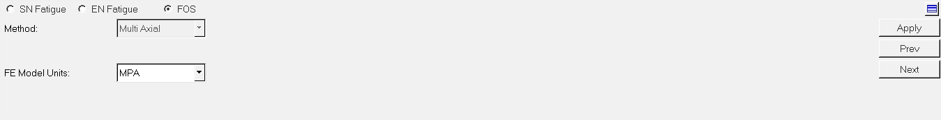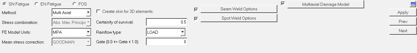Fatigue Processパネルの上部にあるSN Fatigueオプションを選択してから、MethodとしてMulti Axialを選択します。下図のようなパネルが表示されます。