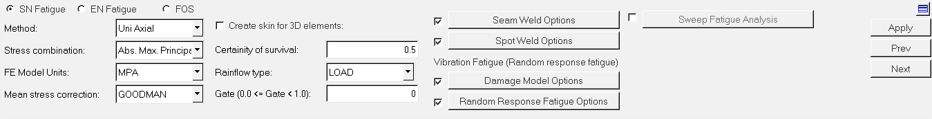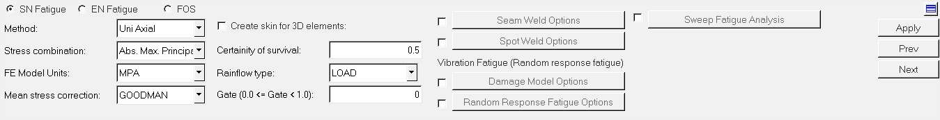 Fatigue Processパネルの上部にあるSN Fatigueオプションを選択してから、MethodとしてUni Axialを選択します。下図のようなパネルが表示されます。