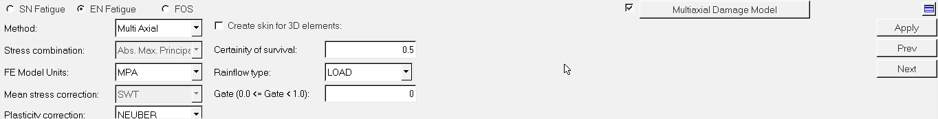 Fatigue Processパネルの上部にあるEN Fatigueオプションを選択してから、MethodとしてMulti Axialを選択します。下図のようなパネルが表示されます。