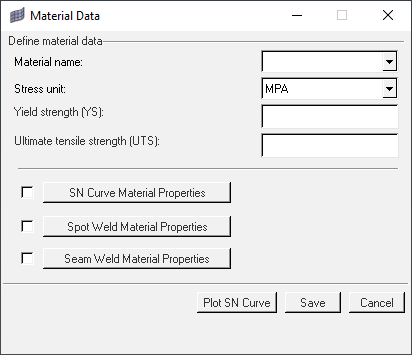 欄名 値 Material Name 疲労材料プロパティによって更新する材料を選択 Stress Unit MPA、PA、PSI、またはKSI Yield Strength (YS) 値入力 Ultimate Tensile Strength (UTS) 値入力 SN Curve Material Properties このオプションを選択後、SN Curve Material Propertiesダイアログで値を入力 Spot Weld Material Properties このオプションを選択後、Spot Weld Material Propertiesダイアログで値を入力 Seam Weld Material Properties このオプションを選択後、Seam Weld Material Propertiesダイアログで値を入力 -