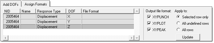 以下に示すフォーマットファイルに出力される応答ポイントとDOFを定義します:XYPUNCH、XYPLOT、およびXYPEAK。