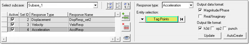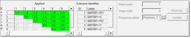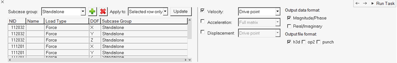 - サブケースごとの定義では、サブケースを選択後、リストボックスからDOF行を選択し、荷重強度を実数/虚数または位相/絶対値の形式で周波数テーブルに追加します。