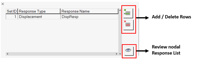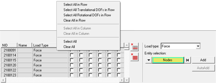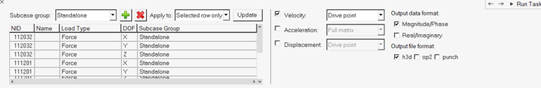 また、個々のサブケースで使用される新たな入力サブケースグループを作成することも可能です。新規サブケースグループを追加するには、Add Groupアイコンをクリックします。テーブル内で1つまたは複数の行を選択してから、新たに作成されたサブケースグループを選択して、Updateをクリックできます。1つのサブケースグループに属するすべての入力自由度は、1つのサブケースにおける同時加振として使用されます。図 28.