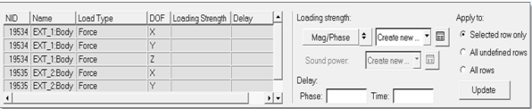 Define Input Points, Define Load Strengthタスクでは、個々のサブケースにおける周波数依存の荷重強度と位相遅れ、または1つのサブケースにおける自由度を指定します。