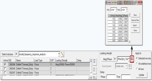 - サブケースごとの定義では、サブケースを選択後、リストボックスからDOF行を選択し、荷重強度を実数/虚数または位相/絶対値の形式で周波数テーブルに追加します。オプションで、入力自由度に関連する遅れまたは位相を指定できます。荷重強度は、csv/text形式の外部ファイル、およびLMSやB&Kなどの外部データ取得ツールのユニバーサル(.unv)ファイルで手動で定義できます。.csv/textまたはユニバーサルファイルをインポートして適切な荷重強度を選択し、Saveをクリックすることでこれを定義します。右側のラジオボタンを使用し、与えられた設定内容を入力として反映する行を選択します。Create SubcaseアイコンをクリックしてSubcase Definitionパネルに戻り、新しいサブケースを追加したり、既存のサブケースを編集したりすることもできます。サブケースが追加、または修正された場合、Select Analysis Frequencies タスクに戻されますので、荷重強度を定義する前に再びすべての手順を繰り返してください。サブケースを編集しない場合、Define Load Strengthタスクに戻ります。