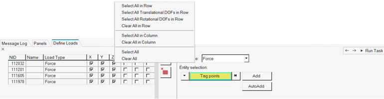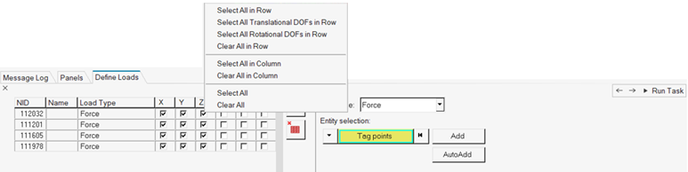 Define Input Points & Requests, Define Loadsタスクで、適用される荷重のタイプを指定します。