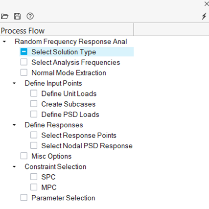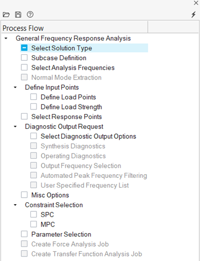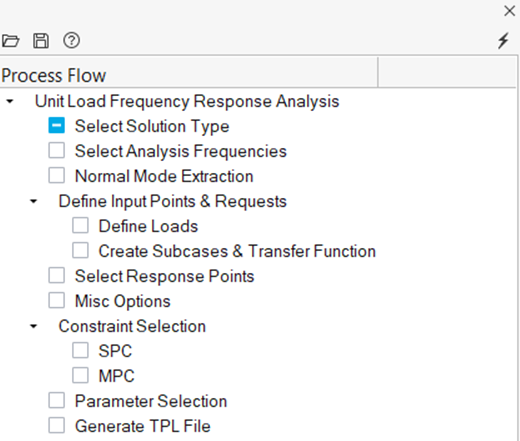 これらのプロセステンプレートは、一般的なエンジニアリングデータの入力を促し、データの設定が終了すると、自動的に周波数応答解析のための荷重ケースおよび関連するソルバーカードが作成されます。テンプレートは、共通のプロセス手順のセットを共有します。この手順は、最初に使用されたときにのみ解説が表示されます。