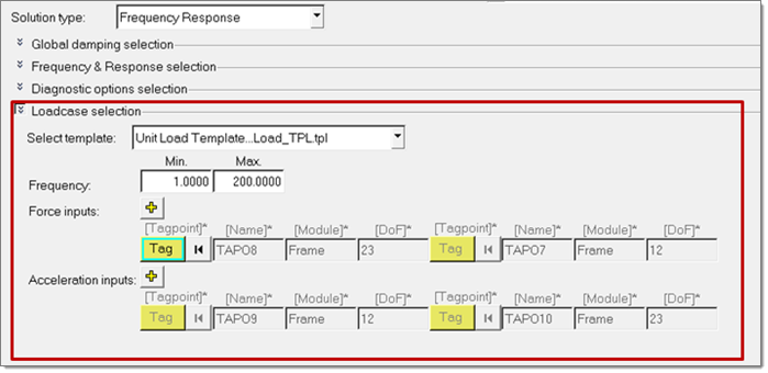 - 単位荷重FRFプロセスマネージャーの荷重ケース部分のパラメータのみを含むファイルにアクセスするには、Loads Only TPLを選択します。Analysis Managerでは、作成されたテンプレートファイルは、Solution type Frequency Responseの荷重ケースとして選択され、general FRFのためのソルバーデックがエクスポートされます。