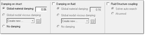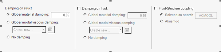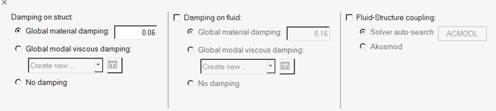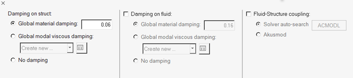 Misc Optionsタスクで、利用可能な減衰オプションを選択します。これには構造に対するグローバルのモーダル粘性減衰または流体に対するグローバルな材料および粘性が含まれます。